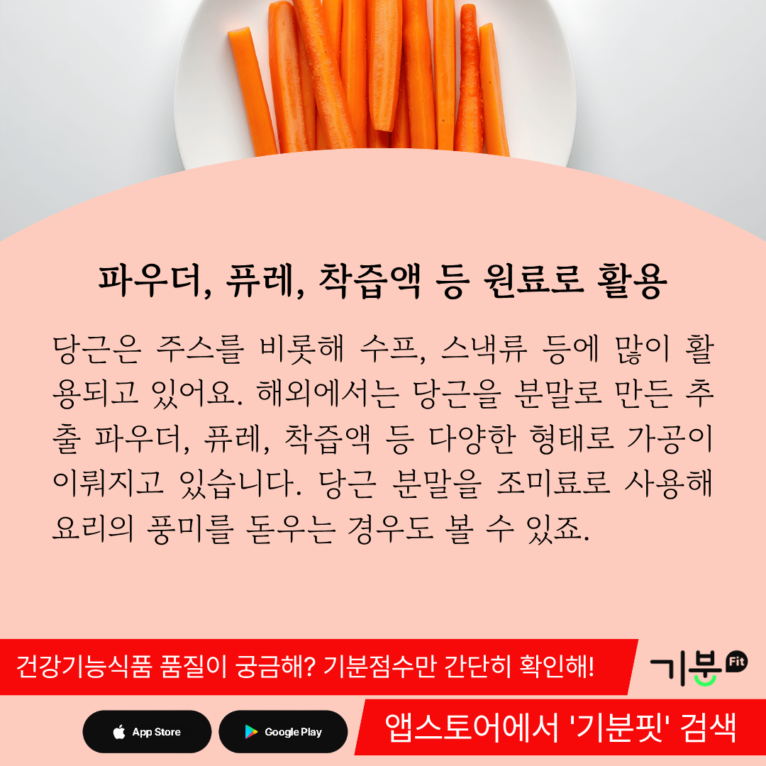 이 때문에 해외에서는 당근을 분말로 만든 추출 파우더, 퓨레, 착즙액 등 다양한 형태의 원료들이 유통되고 있다.