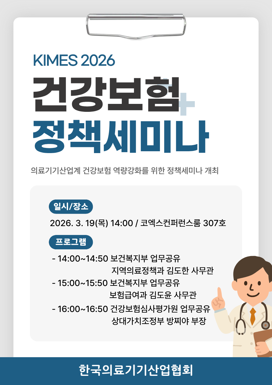 한국의료기기산업협회(회장 김영민)는 보험위원회(위원장 채창형) 주최로 3월 19일 오후 2시 서울 코엑스 컨퍼런스룸 307호에서 ‘KIMES 2026 건강보험정책 세미나’를 개최한다고 밝혔다.