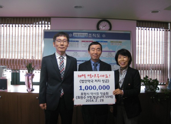 포항시약사회 청솔회(회장 남재만)는 포항시약사회 이문형 회장에게 모임 전 재산의 5분의 1에 해당하는 성금을 법인약국 저지 성금으로 기탁했다.
