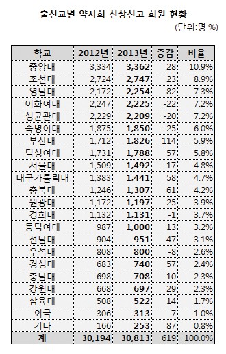 부산대약학대학 동문 숫자가 114명 늘어난 것을 비롯해 2013년 동문 회원이 크게 늘어난 약학대학은 영남대(82명)와 충북대(61명), 대구가톨릭대(58명) 등이었다.