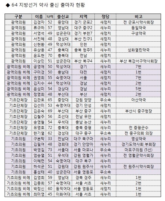 기초의원 비례대표로 김영희 약사는 경북 경주시의원 새누리당 1번 후보로 이름을 올렸고, 박정신 전 대한약사회 총무이사는 서울 영등포구의원 새정치민주연합 1번 후보로 나섰다.
