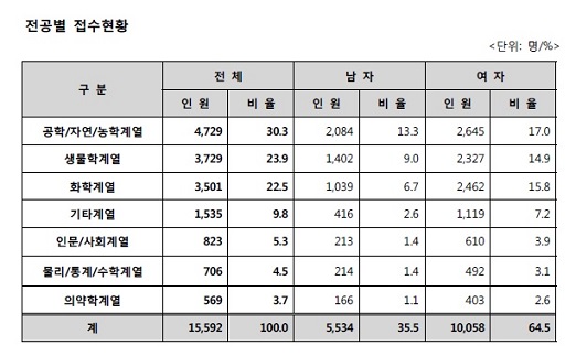접수자의 출신 계열은 공학·자연·농학 계열이 30.3% 비중을 보였으며, 생물학 계열이 23.9%를 차지했다.