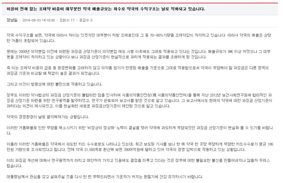 청와대 '국민소통 광장' 자유게시판에는 최근 대한약사회 정남일 홍보위원장의 글이 올라왔다.