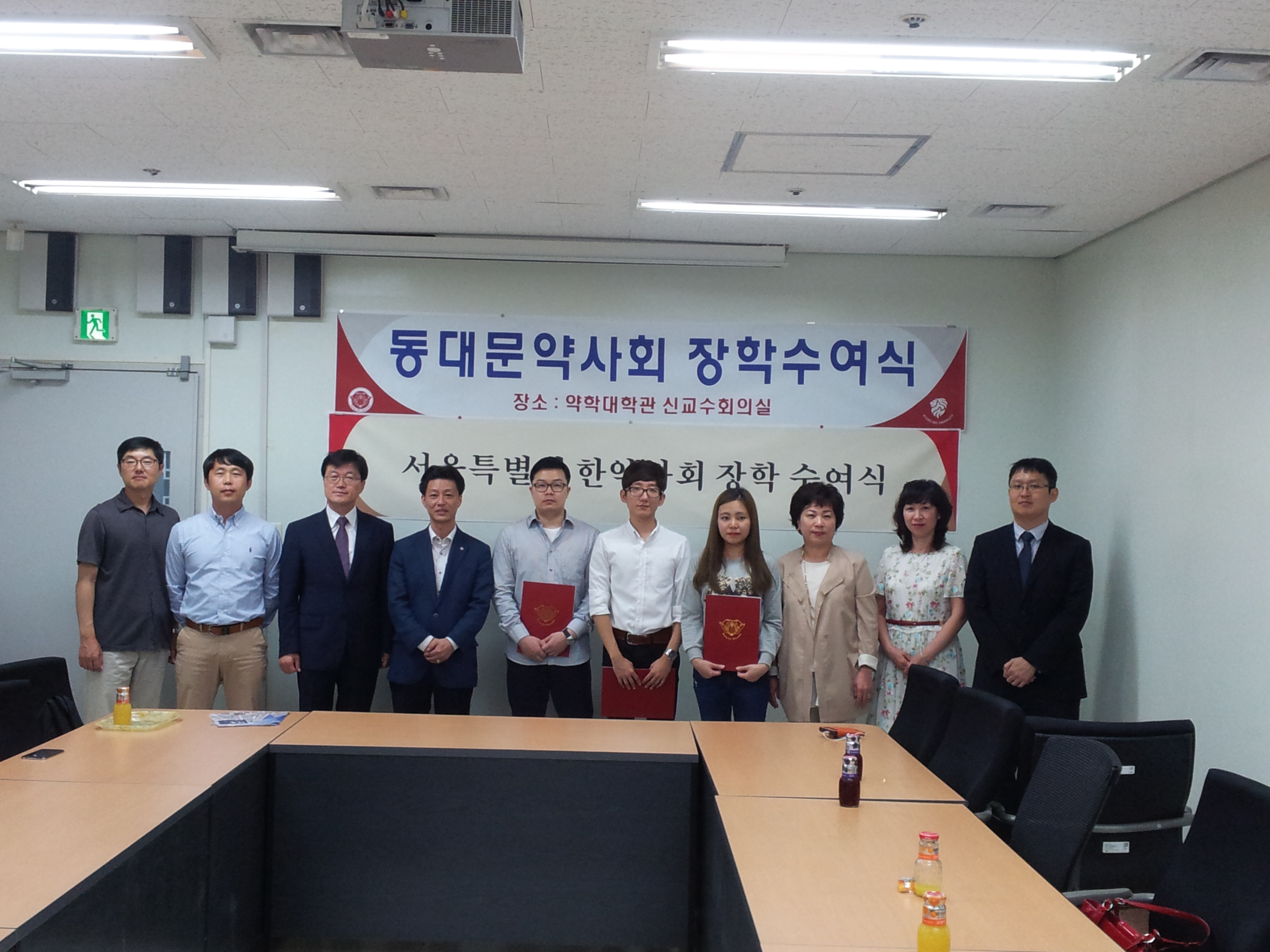 동대문구약사회 (회장 박형숙) 여약사 위원회 (담당부회장 우승희, 위원장 김미숙)는 9월 22일 경희대학교 약학대학 회의실에서 기대윤(약학대) 학생에게 장학금을 전달하고, 경희대학교 약학대 류종훈학장 및 약대 교수진들과 약국실무교육 및 약계 현안에 대해 상호의견을 교환했다.