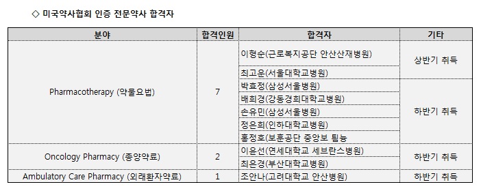 Ambulatory Care Pharmacy(외래환자약료)에서 1명, Oncology Pharmacy(종양약료)와 Pharmacotherapy(약물요법)에서 각각 2명, 7명이 합격했다.