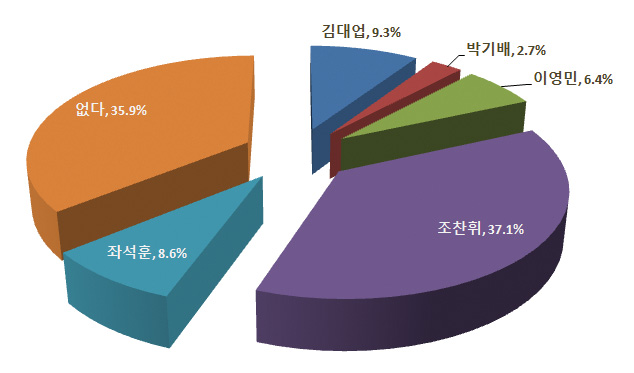 현직인 조찬휘 회장을 제외한 나머지 4명의 예상후보의 지지도를 더한 값은 27.0%로 조찬휘 회장의 지지도 보다 10.1%p 가량 낮은 것으로 파악됐다.