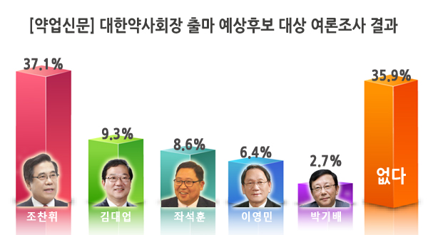 12월에 진행되는 대한약사회장 선거를 앞두고 약업신문이 5명의 출마 예상후보를 대상으로 진행한 여론조사 결과 현직 조찬휘 회장이 압도적인 지지도를 기록했다.