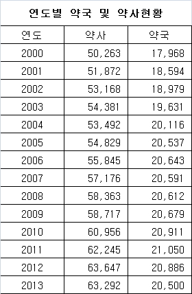 식품의약품안전처가 최근 발간한 '2015년 식품의약품 연보'에 따르면 2013년 기준으로 전국 약국은 2만 500곳, 약사면허 취득자는 6만 3,292명으로 파악됐다.