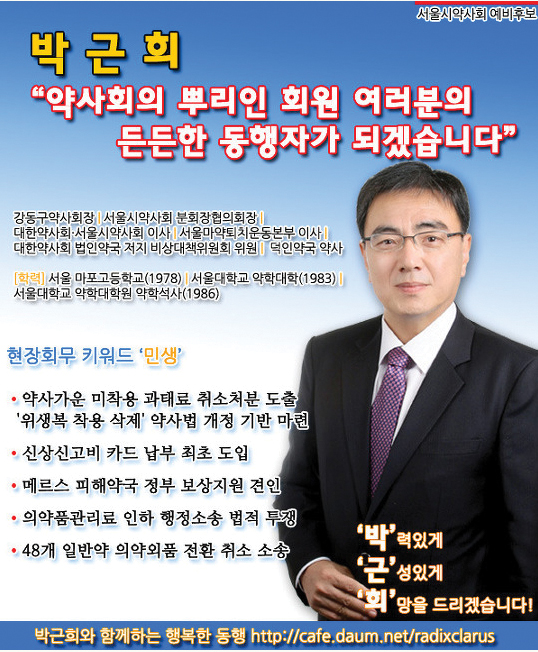 박근희 강동구약사회장은 최근 다음 카페 '박근희와 함께하는 행복한 동행'(http://cafe.daum.net/radixclarus) 카페를 통해 그간의 활동을 알리는 한편 자신이 지향하는 회무 방향을 소개하고 있다.
