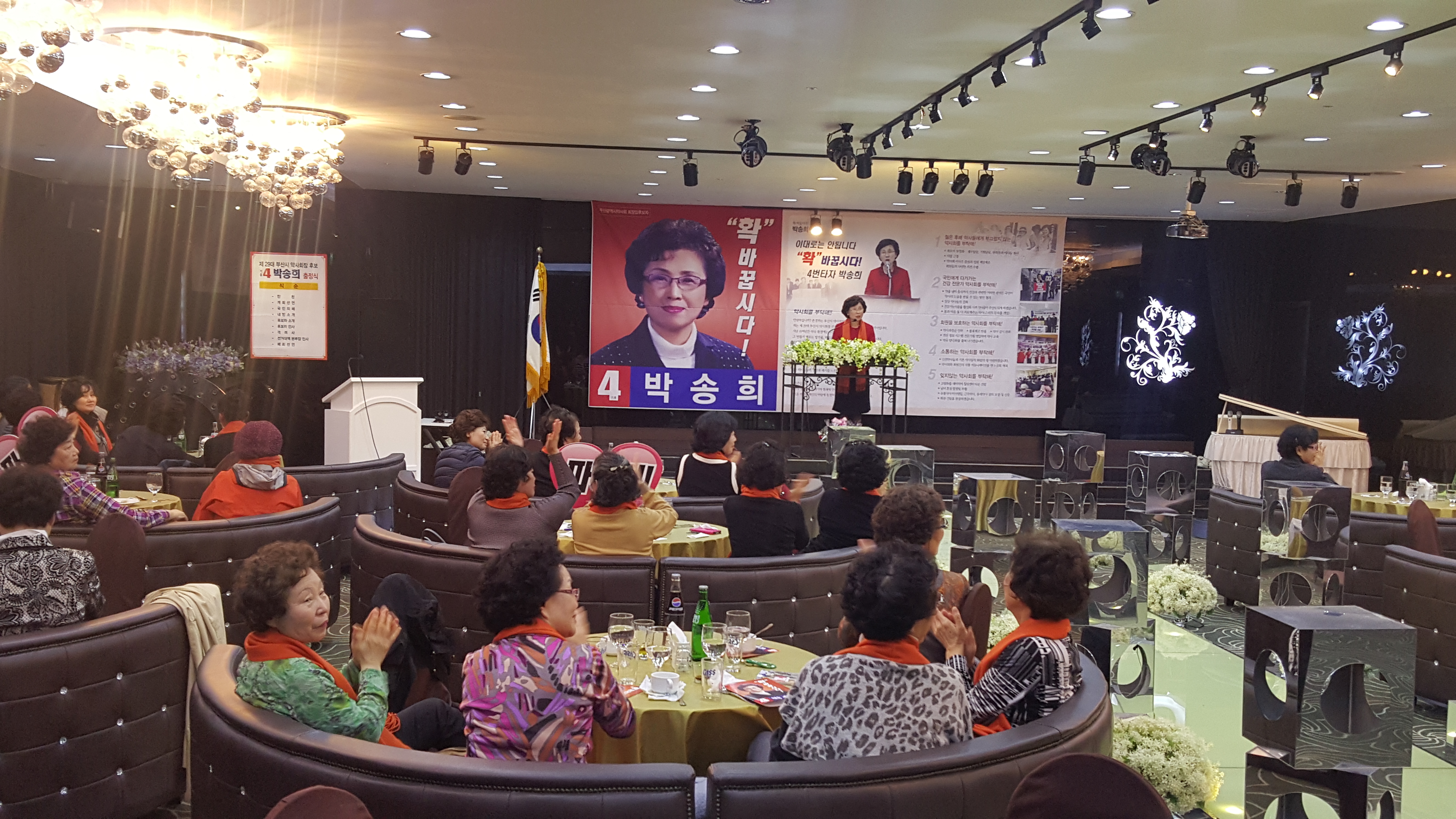 김기묘 전 시의원은 "지도자는 군림하는 시대가 아니라 봉사하는 자리이다. 여약사가 회장을 할때가 왔다. 섬세하고 온화하게 회원을 감싸주고 살펴 줄 수 있는 박송희 후보이다"고 격려했다.