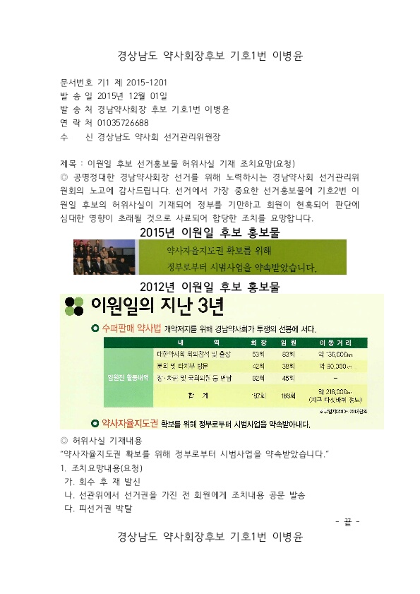 경남약사회장에 출마한 기호1번 이병윤 후보가 기호2번 이원일 후보의 선거 홍보물에 허위사실이 기재됐다며 선관위에 문제를 제기했다.