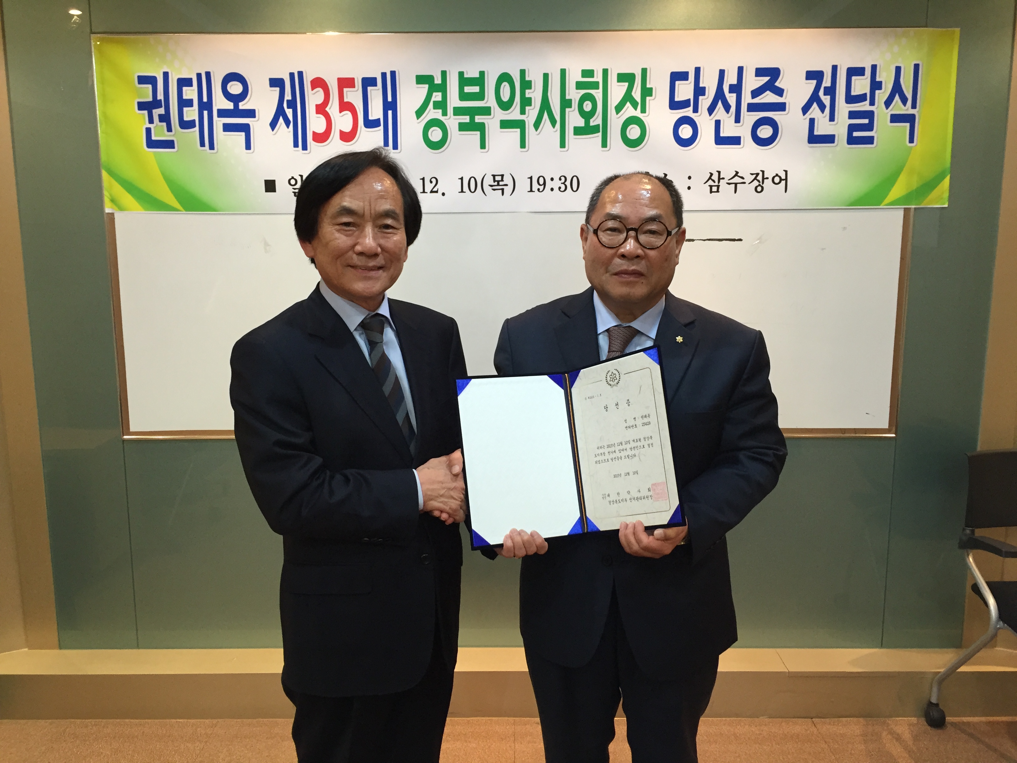 이재국 위원장은 앞으로 경북약사회장직을 성실히 수행해 줄 것을 당부하고 경북약사회 제 35대 회장으로 권태옥 당선인에게 당선증과 함께 축하의 꽃을 전했으며 당선인은 " 답례로 열과성을 다해 경북약사회 발전을 위해 한 몸 바치겠다"고 소감을 밝혔다.