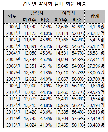 통계집에 따르면 2015년 신상신고를 마친 약사회원은 최종 32,489명으로 파악됐다. 남약사 회원이 1만 4,024명, 여약사 회원이 1만 9,465명으로 여약사의 비중이 계속 높아지고 있는 것으로 나타났다.