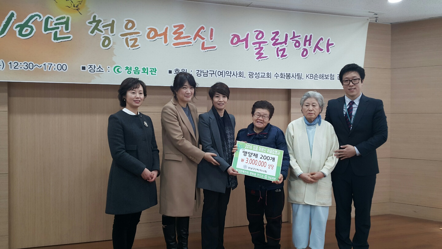 강남구약사회(회장 신성주) 여약사위원회(부회장 이문영, 위원장 김은아)는 지난 3월 3일 청각장애단체인 청음회관(관장 심계원)에서 개최한 '2016년도 청음어르신 어울림행사'에 참석해 영양제를 전달하고 축하했다.