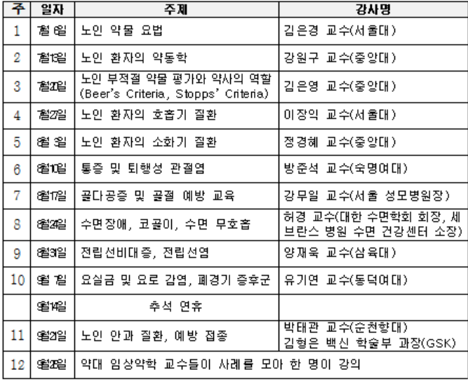 서울특별시약사회(회장 김종환) 학술위원회(부회장 박규동·위원장 김예지·손윤아)는 7월 6일부터 9월 28일까지 12주 동안 매주 수요일 오후 8~10시 ‘지역약국 노인약료 전문가 과정 I’을 개설한다.