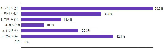 이어 6년제 약사 처우 및 근무환경 개선(42.1%), 정책 설명·논의 등 정책사업(36.8%), 신상신고 홍보 및 청년약사 포럼 등 젊은 약사 참여 사업(26.3%), 취미모임(18.4%), 봉사활동(10.5%) 등의 순이었다.