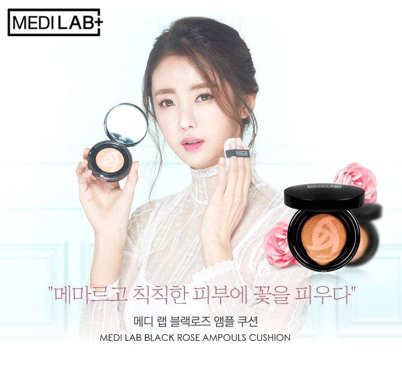 메디랩 블랙로즈 앰플 쿠션에는 다마스크 장미꽃수가 35%가 함유되어 있어 풍부한 장미향과 피부에 벨벳과 같은 부드러운 윤기를 선사해주는 것이 특징이다.