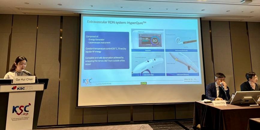딥큐어는 박혁진, 황의창 전남대학교 교수 연구팀이 광진구 그랜드워커힐서 18일부터 20일 까지 열린 제68차 대한심장학회 추계학술대회(KSC 2024)에서 복강경 신장신경차단술(RDN) 의료기기 ‘하이퍼큐어(HyperQure)'에 대해 발표했다고 21일 밝혔다. 하이퍼큐어는 복강경 방식으로 신장 동맥 주변 교감신경을 차단해 저항성 고혈압을 치료하는 의료기기다.