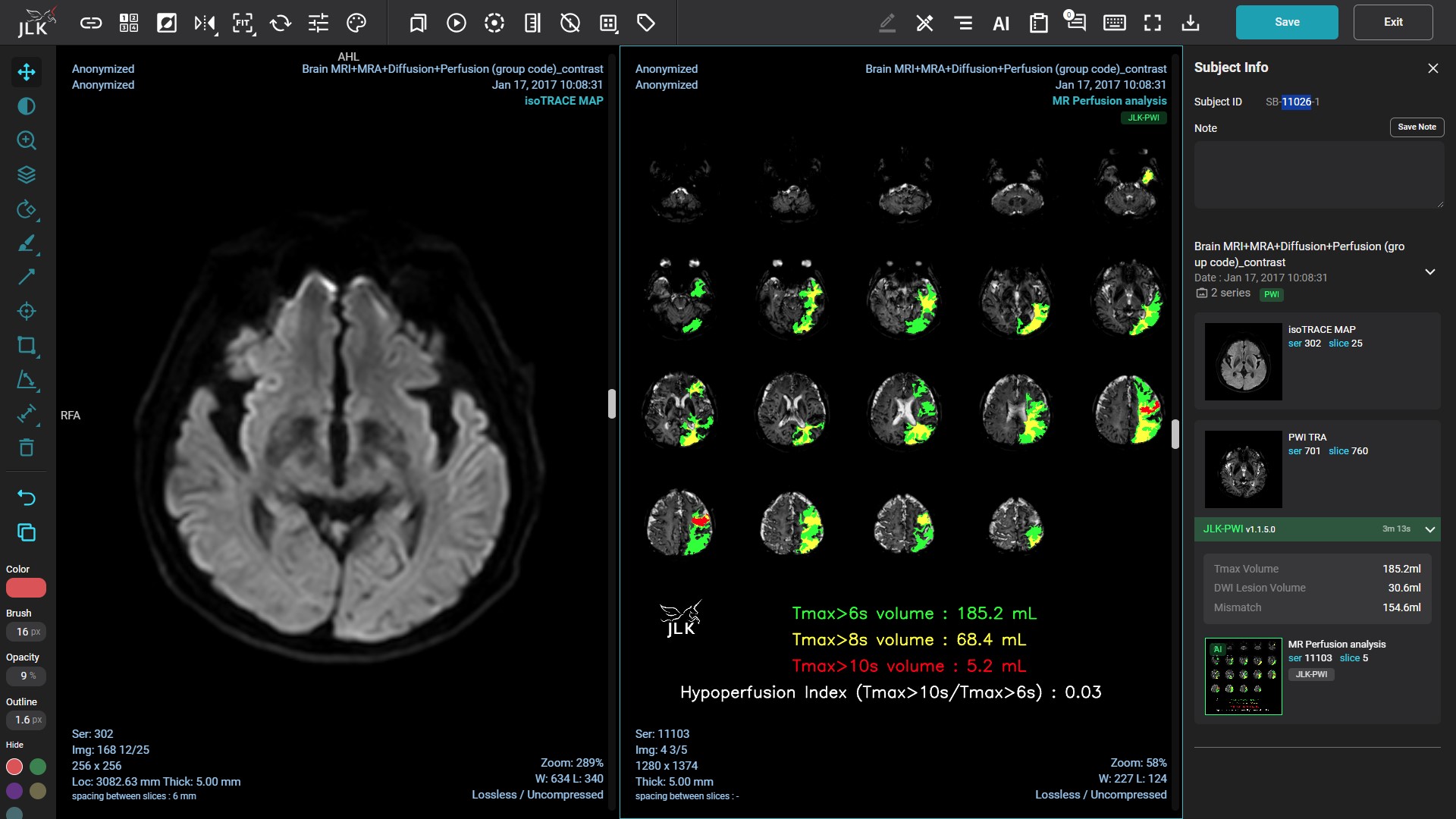 JLK-PWI는 뇌 MR 관류 영상에서 비가역적 뇌손상이 발생한 영역과 혈액 공급이 지연돼 있는 영역을 자동으로 분석해 뇌혈관 재개통 시술 여부를 결정하는 데 도움을 주는 솔루션이다. 이달 미국 FDA와 일본 PMDA 인허가를 획득한 JLK-CTP(뇌 CT 관류 영상 분석 솔루션)와 함께 급성 뇌졸중 치료 골든타임을 지키는 데 큰 역할을 하고 있다.