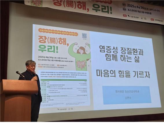 이어진 강연에서 명지병원 정신건강의학과 김현수 교수가 ‘염증성장질환과 함께 하는 삶, 마음의 힘을 기르자’에 대해 발표했다.