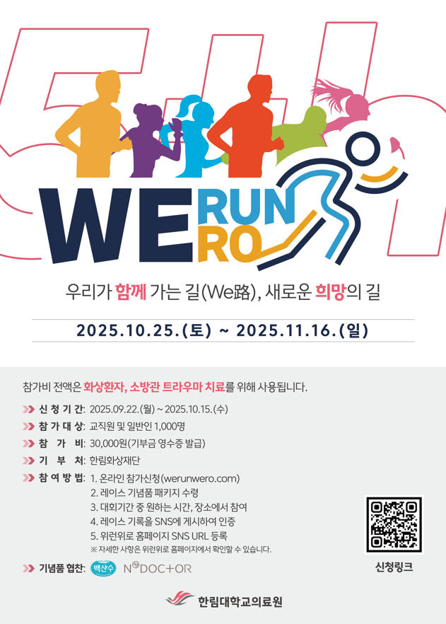 한림대학교의료원은 전국민이 참여할 수 있는 기부 버추얼 레이스 ‘제5회 위런위로(WeRunWe路)’를 2025년 10월 25일부터 11월 16일까지 진행한다. 참가신청은 9월 22일부터 10월 15일까지다.