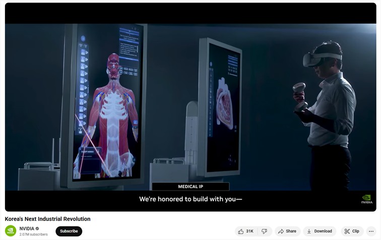 메디컬아이피는 엔비디아가 한국 AI 산업 혁신을 조명하기 위해 제작한 공식 유튜브 영상 “Korea’s Next Revolution”에 삼성, 현대차 등 국내 굴지 대기업들과 함께 소개되었다. 특히 해당 영상은 아시아태평양경제협력체(APEC) CEO 서밋 특별 기조연설에서 상영된 후, 10월 31일 엔비디아 공식 유튜브 채널에도 공개되며 전 세계적으로 대한민국 산업 발전과 AI 중심 기술 전환 여정을 담은 콘텐츠로 주목받았다.