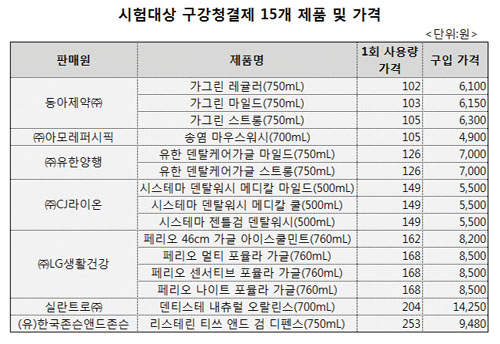 소비자원이 진행한 시험에서 대상이 된 구강청결제는 7개 업체 모두 15개 제품이다.