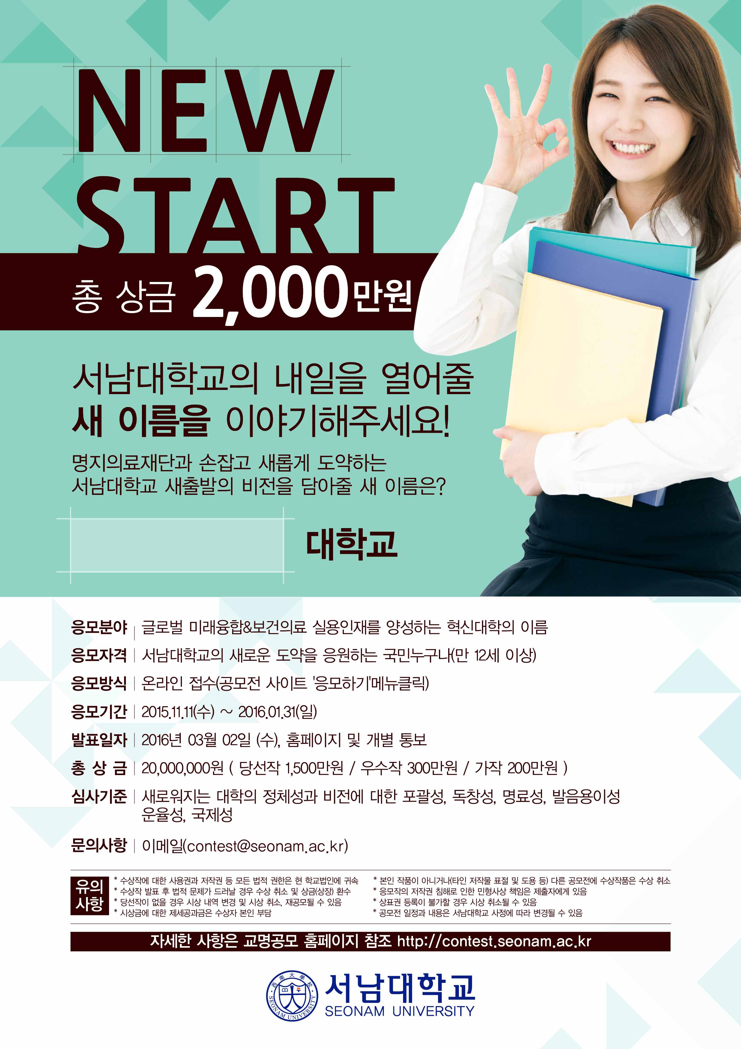 11월 11일부터 시작해 내년 1월 31일까지 진행되는 서남대학교의 새 이름 공모전은 총상금 규모가 2000만원으로 이 중 당선작(1점)에게 1500만원, 우수작(1점) 300만원, 가작(1점) 200만원씩이 돌아간다.