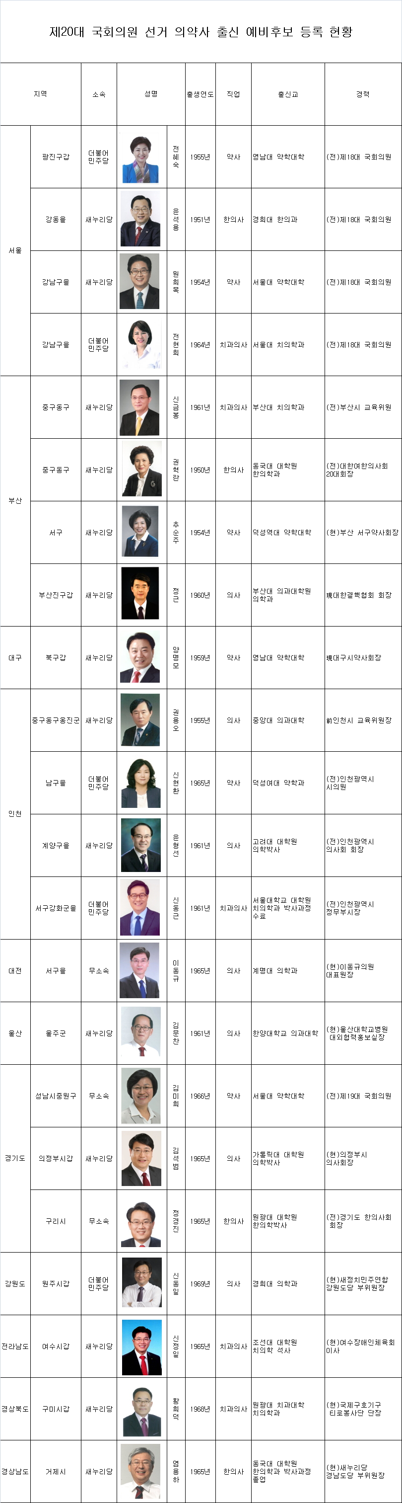 의사 출신은 권용오(인천 중구동구옹진군), 윤형선(인천 계양구을), 정근(부신진구갑), 이동규(대전 서구을), 김문찬(울산 울주군), 김석범(경기 의정부시갑), 신동일(강원 원주시갑) 예비후보 등 7명이다.