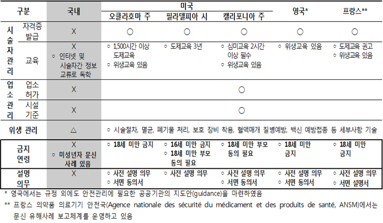 문신을 관리하고 있는 국가 중 미국(오클라호마 주, 필라델피아 시, 캘리포니아 주)과 영국, 프랑스의 규정 및 지침을 시술자·업소관리, 위생관리*, 금기, 사전 설명 의무 등의 사항으로 분류하여 검토했다.