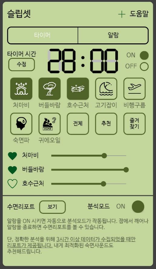 회사 측에 따르면 스마트폰의 중력센서와 가속센서를 활용한 슬립셋에 내장된 약 100여 종의 숙면사운드는 모두 적정 주파수 스펙트럼에 대한 철저한 검사를 거친 후 최소 100여 차례 이상의 실제 반복청취 테스트를 마쳤다.