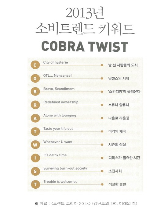 ‘코브라 트위스트(COBRA TWIST)’는 날 선 사람들의 도시(City of hysterie), 난센스의 시대(OTL…Nonsense!), 스칸디맘이 몰려온다(Bravo Scandimom), 소유냐 향유냐(Redefined ownership), 나홀로 라운징(Alone with lounging), 미각의 제국(Taste your life out), 시즌의 상실(Whenever U want), 디톡스가 필요한 시간(It's detox time), 소진사회(Surviving burn-out society), 적절한 불편(Trouble is welcomed)의 머리말을 따서 만든 말이다.