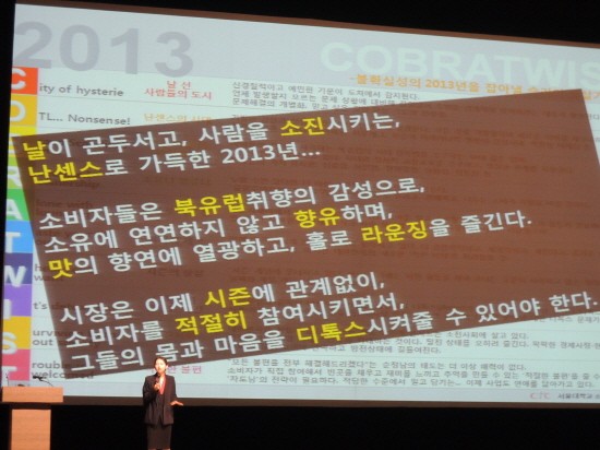 “날이 곤두서고, 사람을 소진시키는, 난센스로 가득한 2013년... 소비자들은 북유럽 취향의 감성으로, 소유에 연연하지 않고 향유하며, 맛의 향연에 열광하고, 홀로 라운징을 즐긴다. 시장은 이제 시즌에 관계없이, 소비자를 적절히 참여시키면서, 그들의 몸과 마음을 디톡스 시켜줄 수 있어야 한다.”