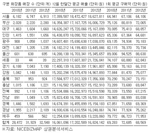 ◇매출=화장품점 전체 매출은 2010년 12월 4,573억원에서 2012년 12월 5,476억원으로 19.7% 증가했다.