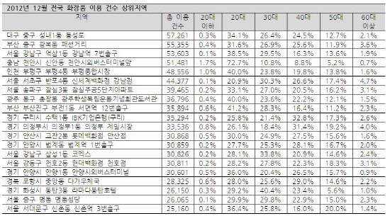 본지가 NICE신용평가정보에 의뢰한 ‘나이스비즈맵 상권분석서비스-화장품점’ 분석 결과에 따르면, 2012년 12월 한 달간 전국 화장품 매장 이용 건수는 대구 동성로 5만7,261건, 부산 광복동 패션거리 5만5,355건, 서울 강남구 강남역 7번 출구 5만3,603건 순으로 집계됐다.