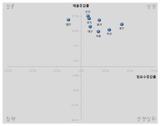 NICEBIZMAP 상권분석서비스 관계자는 “시·도 분석은 전반적인 흐름을 알 수 있을 뿐, 세부지역별로는 다른 양상을 나타낼 수 있으므로 실제 창업, 출점 시에는 세부지역 상권에 대한 분석이 필요하다”고 말했다.