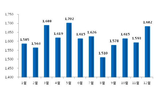 2012년 월 평균 매출이 가장 높은 달은 5월달로 1,702만원이었다. 매출이 가장 낮은 달은 8월로 1,510만원으로 조사됐다.