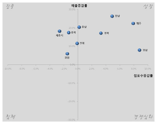 수도권과 광역시를 제외한 시·도별 그래프는 좀 더 확실히 나뉘는 모습을 보인다. 점포 증가율과 매출 증가율이 눈에 띄게 높은 전남, 제주 지역은 화장품 업종이 성장세에 있어 당분간 시장규모가 증가할 것으로 보인다. 반면, 충북, 강원, 세종시의 경우 점포가 줄고 있으므로 전체 시장규모가 증가할지는 미지수다. 출점 가능성이 높은 지역은 전남, 경북, 충남 등이 유리할 것으로 판단된다.
