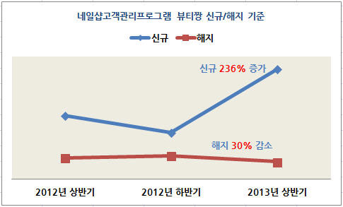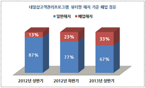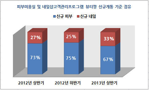 신규가입자수 기준으로 봤을 때는 지난해 하반기 잠시 주춤했던 신규 가입자수가 올해 상반기 235% 증가, 대폭 상승하면서 네일케어 시장에 대한 관심을 입증했다. 신규 가입자 수는 증가한 반면 프로그램 해지의 경우 오히려 올해 30% 감소하면서 네일숍들의 마케팅에 대한 관심이 증가하고 있다는 분석이다.