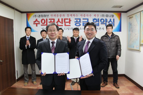 (주)경희허브(대표이사 김정열)는 지난 15일 본사 회의실에서 반려동물 용품 전문 유통업체인 (주)휴니멀(대표이사 정영상)과 ‘수의공신단 공급 협약식’을 가졌다.