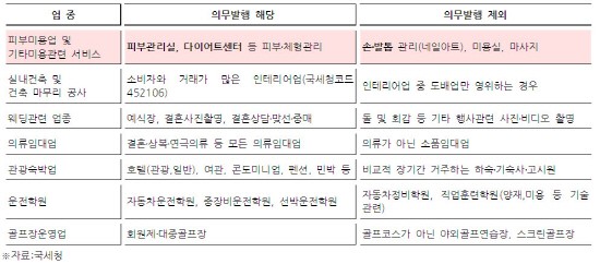 피부미용업 및 기타미용관련 서비스 업종 가운데 팩, 제모, 눈썹손질을 하는 피부관리실, 체형을 만들거나 유지하기 위한 다이어트센터 등 피부?체형관리는 의무적으로 발행해야 한다.