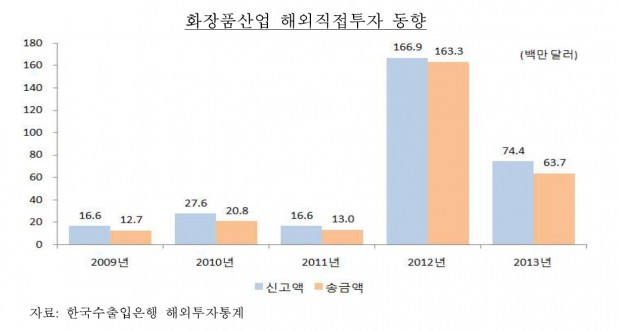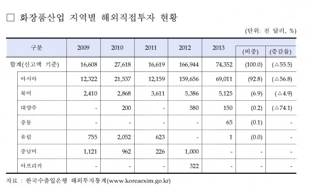 지난해 국내 화장품산업의 해외직접투자 규모가 전년 보다 반토막 수준으로 떨어지고 해외직접투자는 중국 등 아시아 지역에 편중된 것으로 나타났다. 국내 화장품 주문자상표부착생산(OEM) 기업이 늘면서 현지 제조는 2012년보다 240% 이상 증가했다.
