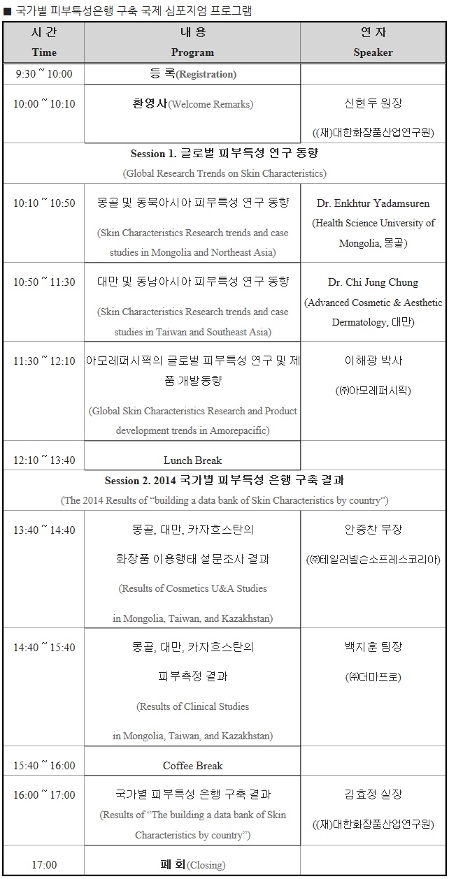 2개 세션과 6건의 강의로 진행되는 이번 심포지엄에는 몽골과 대만의 피부과 전문의가 연자로 나와 현지인의 피부특성과 문화 및 화장품시장과 한국산 화장품 진출전략 등을 발표한다.
