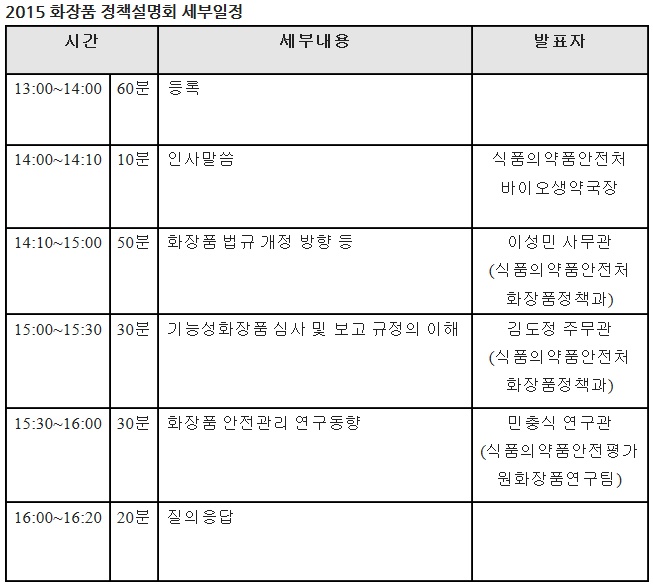 식품의약품안전처가 오는 4월 23일 오후 2시부터 일산 킨텍스 제1전시장내 현장 세미나실에서 ‘2015년 화장품 정책설명회’를 연다.