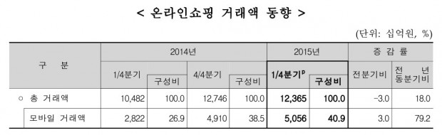 2015년 1/4분기 온라인 쇼핑 거래액은 12조3,650억원으로 전년 동분기 대비 18.0% 증가했으며, 이 가운데 모바일 쇼핑 거래액은 5조560억원으로 79.2%가 늘어난 것으로 나타났다. 전 분기와 비교해서는 온라인 쇼핑 거래액은 3.0% 감소한 반면 모바일 쇼핑 거래액은 3.0% 증가했다. 온라인 쇼핑 거래액 중 모바일 쇼핑 거래액이 차지하는 비중은 40.9%로 매분기마다 지속적으로 상승하고 있다.