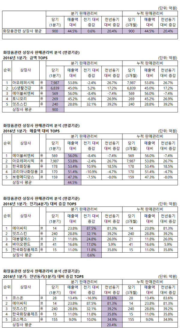 아모레퍼시픽은 53.8%, 한국화장품은 53.4%, 코리아나화장품은 51.4%를 지출하면서 2-4위 모두 전체매출의 50% 이상을 판매관리비로 사용했다. 코리아나화장품의 경우 코스닥 상장사 중 가장 높은 비중을 나타냈고, 이어 코스닥 상장사인 보령메디앙스가 상장사 평균(44.5%)보다 높은 47.3%를 기록했다.