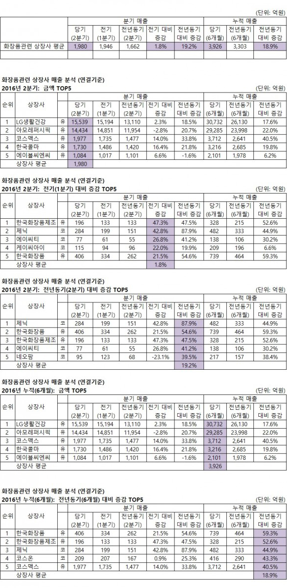약업닷컴과 뷰티누리(화장품신문)이 화장품관련 코스피 9개사와 코스닥 11개사 등 총 20개사의 2분기 및 상반기 매출실적을 분석한 결과, 2분기 기준, 가장 많은 매출을 올린 곳은 1조5539억원을 기록한 LG생활건강이었으며 전년 동기대비 성장률이 가장 높았던 곳은 87.9% 늘어난 제닉이었다.