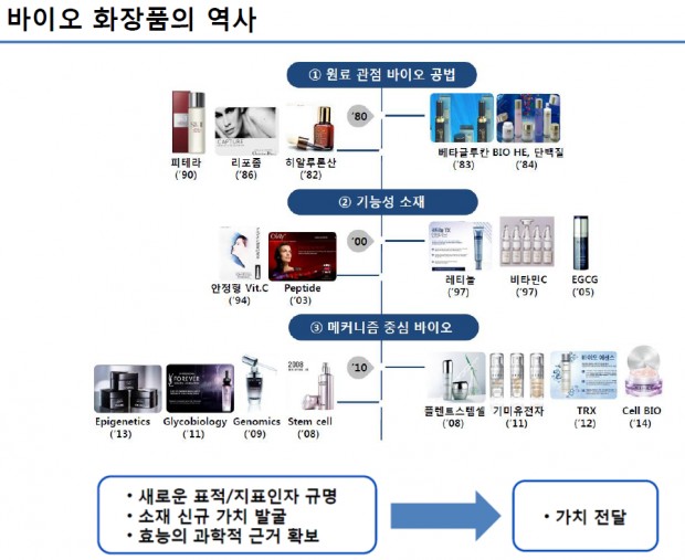 화장품 효능은 2000년대 들어 자연(Green, Natural) 성분과 실효성 강화에 이어 2009년부터 노화 원인 규명과 대응 솔루션(Solution)으로 진화, 유전자·줄기 세포 지식이 적용되기 시작하고 있다고 보았다.