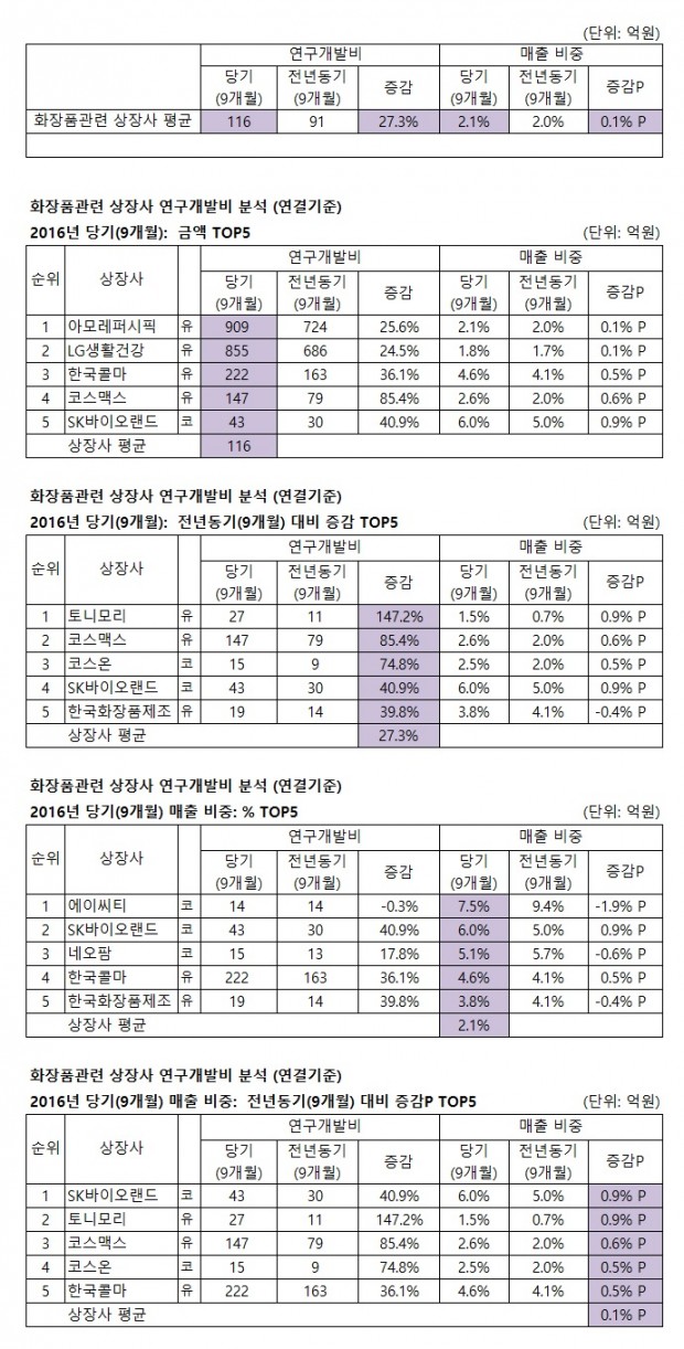올 3분기(1월~9월)까지 국내 22개 화장품 관련 상장사(코스피·코스닥)가 지출한 연구개발비는 평균 116억원으로 지난해 같은 기간의 91억원보다 27.3% 증가했다.