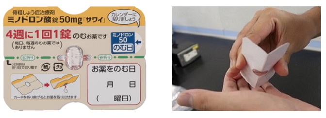 사와이의 ‘미노드론산’은 적정사용·편리성을 고려한 PTP시트를 패지키에 채용하고 있다. 사와이는 환자가 보다 사용하기 편한 포장을 검토한 결과, 업계 최초로 주식회사 카나에가 가진 특수한 기술을 이용하여 카드를 접어 정제를 꺼낼 수 있는 디자인 사양을 채택했다.